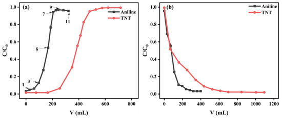 (a) Adsorption and (b) release curves of aniline and TNT. 1, 3, 5, 7, 9 and 11 are sample sites with effluent volumes of 26.5, 96.5, 168.0, 206.5, 245.0, and 322.0 mL, respectively.