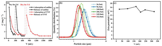 Effluent volumes of 26.5, 96.5, 168.0, 206.5, 245.0, and 322.0 mL were selected to analyze particle size distribution (Figure 7b) and Zeta potential (Figure 7c). The results suggested the particle size of loess colloid particles in the effluent ranged from 0.1 to 10 μm, and the absolute Zeta potential was greater than 10. Consequently, loess colloid particles are less likely to settle on the soil surface but have the potential to transport in the soil. Meanwhile, the findings showed that the loess colloid particles prepared in the static adsorption experiment were suitable and accurate. In brief, the results of static adsorption can indirectly reflect the transport of aniline and TNT on loess colloid particles in dynamic simulated column experiments.