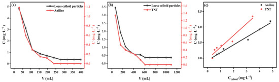 In the release experiment, the existence form of organic compound in effluent was separated (Figure 8). The results showed that the aniline and TNT in effluent were partially adsorbed on the loess colloid particles and existed in the particle adsorption state. It confirmed that loess colloid particles have an adsorption capacity for aniline and TNT, and the conclusions of adsorption characteristics in static experiments have the potential to be applied to the dynamic simulated column experiments. In addition, the changes in the concentrations of aniline and TNT on the particles were comparable to those of loess colloid particles (Figure 8a,b). The correlation fitting between particle adsorption state concentration of the two organic compounds and loess colloid particle concentration is illustrated in Figure 8c. The results of the fitting showed that the correlation analysis was significant, with correlation coefficients (R2) of 0.9796 and 0.9435, respectively. It is reasonable to conclude that loess colloid particles could act as carriers of aniline and TNT, enhancing the transport of organic pollutants through van der Waals force, hydrogen bonding, and electrostatic interaction along the water flow. A recent study confirmed the same, that clay colloids could serve as carriers for ciprofloxacin [68]. By analyzing the concentration of aniline and TNT on loess colloid particles and effluent volume at a low stable value, it was discovered that the transport rate of loess colloid particles with aniline was greater than that of TNT. This analysis was also consistent with the conclusion drawn from the static experiment. Therefore, the adsorption characteristics of aniline and TNT on loess colloid particles can provide an effective explanation for their transport mechanism. Combined with static adsorption kinetics analysis, the transport rate was mainly affected by the polarity, molecular size, and structure of the organic compound. The main reasons that aniline exhibited a greater adsorption rate than TNT were its larger polarity, smaller molecular weight, and smaller volume (Table S7).