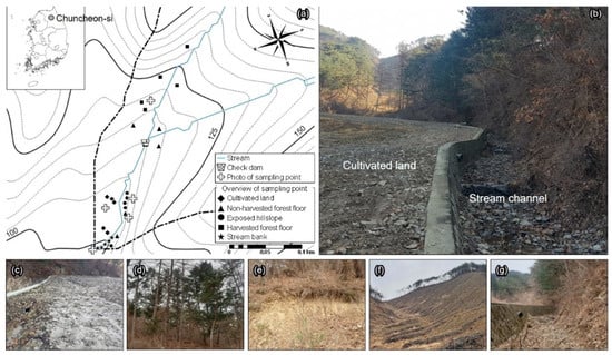 Location and field photos of the study site. (a) Location map with sampling points and (b) upstream view from the outlet. Potential sources of suspended sediment (SS) at this study site: (c) cultivated land, (d) non-harvested forest floor, (e) exposed hillslope, (f) harvested forest floor, and (g) stream bank. Photos in (c–g) also show overview of sampling points for potential sources of SS.