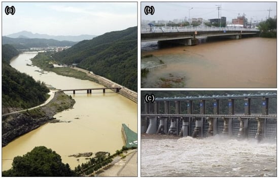 Views of turbid water occurrence due to suspended sediment transport during East Asian summer monsoon in (a) Lake Soyang [51], (b) Gongjicheon [52], and (c) Uiam dam [53] watersheds in Chuncheon-si, South Korea.