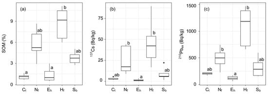 Comparison of differences in (a) SOM, (b) 137Cs, and (c) 210Pbex concentrations among the potential SS sources. Cl: cultivated land, Nf: non-harvested forest floor, Eh: eroded hillslope, Hf: harvested forest floor, Sb: stream bank. The upper and lower hinges correspond to the first and third quartiles (the 25th and 75th percentiles). The whiskers extend from the hinges to the highest and lowest values that are within 1.5 (the interquartile range). Values beyond the end of the whiskers are outliers and plotted as points. Different letters indicate statistical significance (Bonferroni’s post hoc tests after one-way ANOVA and Mann–Whitney U).