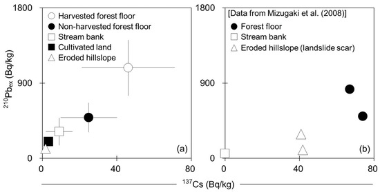 The results of this study (Figure 4a) were similar to those of Mizaugaki et al. [31], who found that 137Cs and 210Pbex activities were much higher in forest floors than in other potential SS sources, including stream banks and landslide scars (Figure 4b). Figure 5 presents a comparison of the 137Cs values analyzed in this study with the results of other domestic studies. Although there are no reference data on the 210Pbex concentration in other domestic studies [36,46], it is expected to exhibit a similar pattern to the 137Cs concentrations of potential SS sources. Harvested and non-harvested forest floors exhibited high concentrations, whereas eroded hillslopes, forest roads, and channel banks exhibited low concentrations owing to subsurface material exposure on the surface areas, as observed in the Woldong catchment [36] and Yeongsan River [46] (Figure 5).