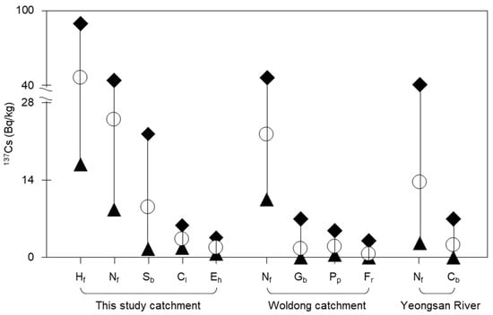Maximum (◆), minimum (▲), and mean (◯) values of 137Cs concentration in the potential SS source materials for difference between this study catchment and both Woldong catchment [36] and Yeongsan River [46]. The sources are Hf (harvested forest floor), Nf (non-harvested forest floor), Sb (stream bank), Cl (cultivated land), Eh (eroded hillslope), Gb (gully bank), Pp (paddy plain), Fr (forest road), and Cb (channel bank).