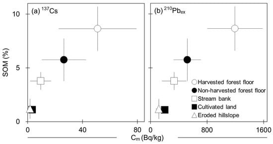 Relationship between fallout radionuclides activity ((a) 137Cs and (b) 210Pbex) associated with the mineral fraction (Cm) and SOM. The error bar indicates the standard deviation.