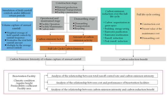 This study innovates by utilizing the storm intensity formula to derive the calculation formula for the total annual runoff control volume. It introduces the concept of carbon emission intensity for the total runoff control volume throughout the entire life cycle and achieves an evaluation of the combined contribution of bioretention facilities to rainfall and carbon emissions.