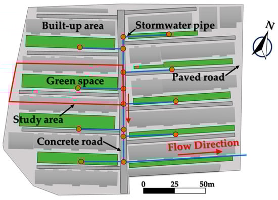 The study area is in a newly built residential area in Tianshui, Gansu Province. It is a catchment area within the residential area, and the study simulates the performance of a bioretention facility in this catchment area. The study area is 2930 m2, consisting of built-up areas, green spaces, and roads (including concrete and paved roads). Stormwater pipes and outlets were set up based on the elevation and pipe layout of the study area. The natural drainage direction is from northwest to southeast, as shown in Figure 2.