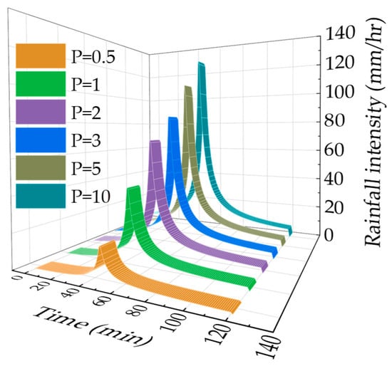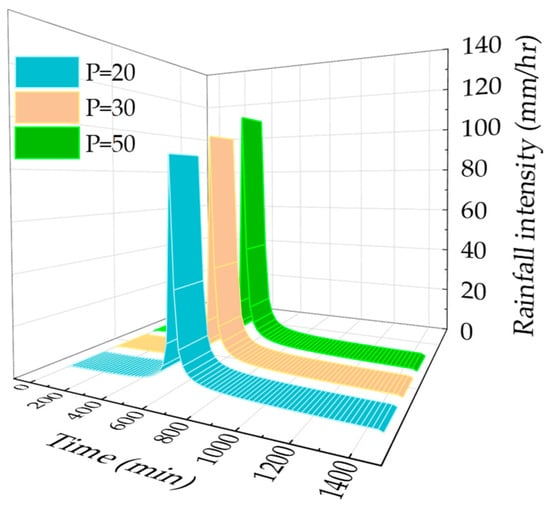 Using the Chicago Rainfall Type Generation Software (1.0), a rainfall intensity curve with a peak coefficient of 0.398 was generated based on Equation (1) for design rainfall return periods of 0.5 a, 1 a, 2 a, 3 a, 5 a, and 10 a, with a rainfall duration of 120 min (Figure 3). Similarly, a long-duration rainfall curve with a rainfall duration of 1440 min was generated based on Equation (2) for design rainfall return periods of 20 a, 30 a, and 50 a, as shown in Figure 4.