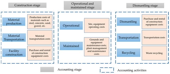 This study only analyzed the full life cycle costing of LID facilities, including construction, operation and maintenance, and removal costs, without considering other required costs (Figure 5). The life cycle of the BF is set to 30 years in this paper. The calculation formula refers to existing research results [42,43,44,45,46], such as Equations (5)–(8):