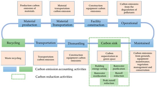 - Li, J.; Zhang, X.; Huimin, L. Study on carbon emission accounting in construction and operation of a sponge city in Beijing. Water Resour. Prot. 2023, 39, 86–93. [Google Scholar]
