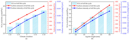 Impact of (a) climatic conditions, (b) aquifer height, (c) permeability coefficient, and (d) the facility area on carbon emissions and carbon intensity.