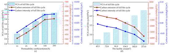 As shown in Figure 8a, climate change affects rainwater control performance: as the intensity of storms increases, the VCA of the facility increases, which shows that the BF has a stormwater control capacity for increasing rainfall. The life cycle carbon emissions under different climatic conditions ranged from −874.1175 kg CO2 to −657.3433 kg CO2. The carbon intensity ranged from −0.0306 kg CO2/m3 to −0.0176 kg CO2/m3, with a changing trend that is consistent with the life cycle carbon emissions and a variation range of 74%. The full life cycle carbon emissions gradually increased with the increase in rainfall because of the constant parameters of the BF. Carbon emissions and carbon sinks stay unaltered during the construction and demolition stages. However, the change in climatic conditions led to a shift in rainfall, and the organic substance in the corresponding runoff was treated by the BF, which increased the direct carbon emissions during the operation and maintenance stage, increasing life cycle carbon emissions.