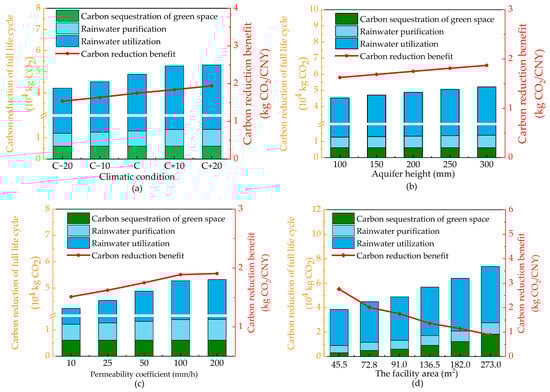 Effects of (a) climatic conditions, (b) aquifer height, (c) permeability coefficient, and (d) the facility area on the carbon reduction benefit.