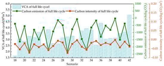 Figure 10 illustrates the outcomes in terms of carbon emission of the volume capture and carbon intensity throughout the full life cycle for various scenarios related to the bioretention facility. These scenarios correspond to numbers 19–42, as outlined in Table 2.