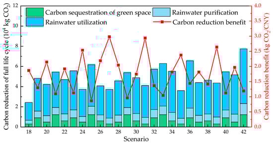The proportion of carbon emissions from stages or activities of the full life cycle of the BF in scenario 32 is shown in Figure 7. According to Equations (9)–(12), the carbon emission in the full life cycle can be calculated as follows: 5895.33 kg CO2 for the construction stage, 921.56 kg CO2 and 700.25 kg CO2 for the operation activity and maintenance activity in the operation and maintenance stage, and 80.54 kg CO2 for the dismantling phase. In addition, we calculated −9131.85 kg CO2 for the carbon sink of the full life cycle. The pure carbon emission (sum of carbon emissions and sinks) during the operation and maintenance stage is −7524.16 kg CO2, and the pure carbon emission during the full life cycle is −1458.10 kg CO2. The carbon emission accounting results of the full life cycle of bioretention facilities in this study differ from some existing research results [32,52] because of the inconsistency in the definition of carbon sinks in the boundary of full life cycle accounting. The related studies’ results include carbon sequestration in green spaces, rainwater purification, and rainwater utilization of the operation and maintenance phase of the bioretention facilities as carbon sinks in the accounting system. In this paper, referring to the relevant literature [53], only the activities that produce resources or energy in the production process and can be delivered to the outside are defined as carbon sinks, and the actions that meet this condition are the greenfield carbon sequestration in the operation and maintenance stage of bioretention facilities. Other activities in the operation and maintenance phase of bioretention facilities, such as rainwater purification and utilization, do not satisfy this study’s definition of carbon sinks. Together with the sink activities, they are defined as carbon emission reductions, which is outside the boundary of the full life cycle accounting and is discussed separately in Section 3.3.