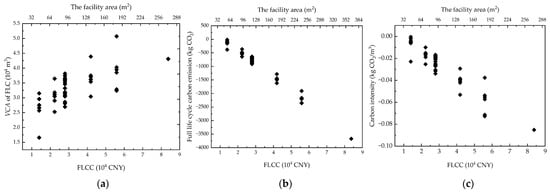 A comparative analysis of the size and cost of bioretention facilities and all of their capacities in different scenarios was carried out. The results of the analysis are shown in Figure 13. Figure 13a illustrates that the water control capacity of the BF gradually increases with the rise in cost, leading to a simultaneous decrease in the full life carbon emission and carbon emission intensity. The primary driver for the increased cost is the expansion of the facility area. The figure illustrates a direct proportional relationship between the size of the BF and the cost. The relationship between the cost and the full life cycle carbon emissions is inverse, and it can be learned from Figure 13b,c that if the area of the bioretention facility deployment increases, the volume of water that can be captured by the facility during rainfall increases, the area of green space can lead to carbon sinks, and the amount of carbon sequestered increases with the increase in the area of deployment. These carbon sinks effectively offset the heightened carbon emissions incurred during the construction, operation, and maintenance of bioretention facilities. Han et al. [62] indicate that the larger the size of the BF, the higher the social benefits. However, their findings did not include results related to carbon emissions within the context of social benefits. Furthermore, the change in cost and carbon intensity displayed an inverse proportionality, indicating that the carbon emissions per unit of water controlled by bioretention facilities decreased as the deployment area increased.