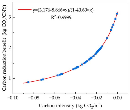 In order to further explore the relationship between carbon emission intensity and carbon reduction benefits, this study conducted a linear fitting of the two quantities for all scenarios, and the results are shown in Figure 14.