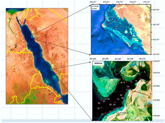 The Red Sea plays a significant role in the economies of its bordering nations, with its contributions spanning fishing, tourism, leisure activities, and shipping routes. The coastal habitats of the Red Sea are among the most unique and diverse ecosystems in the world [1]. They are primarily shaped by its geographical and environmental conditions such as geological formation, high salinity, and warm and clear water [2,3,4]. Situated along the Red Sea, the coast of Saudi Arabia is recognized for its diverse coastal habitats, such as mangroves [5,6,7], coral reefs [8,9], seagrass meadows [10,11,12,13], and rocky beaches [14], which support a wide array of marine life. These diverse coastal habitats, including coastal lagoon ecosystems along the Red Sea coast of Saudi Arabia, emphasize the region’s ecological importance and its role in conserving marine biodiversity.