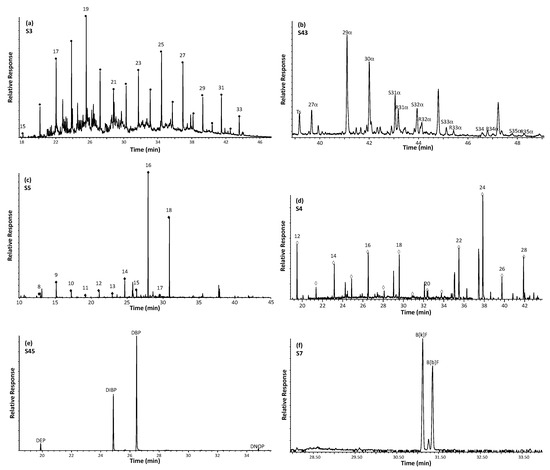 The identification of hydrocarbon compounds relied on comparing their retention times with those of external standards and utilizing GC-MS data. The identification of n-alkanes, fatty acid methyl esters (FAME), n-alkanoic acids, n-alkanols, hopanes, steranes, polycyclic aromatic hydrocarbons (PAHs), and plasticizers (mainly phthalates) is based primarily on their key ion pattern and mass spectra (i.e., m/z 85, 87, 117, 103, 191, 217/218, 128/178/202/228/252/276/300, and 149, respectively). Quantification was performed by examining the total ion current (TIC) GC profiles through the external standard method, utilizing authentic compounds representative of each homologous series [47,53,54].