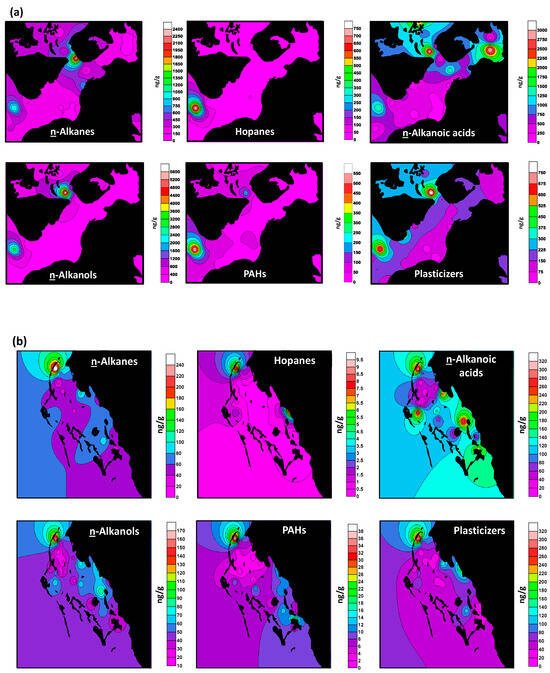 Marine organic matter (OM) generally serves as a key indicator in the analysis of biogeochemical processes in coastal sediments. It encompasses various compound classes, including carbohydrates, lipids, proteins, and other organic compounds [26,27,28]. Within the water column, sediment, and sediment–water interface, this mixture of molecules undergoes degradation and alteration processes [29]. Among these compounds are aliphatic and cyclic hydrocarbons, exhibiting distinct and significant characteristics attributed to different sources due to their resistance to degradation and early diagenetic alteration. These compounds serve as useful tracers for identifying the sources of hydrocarbons because they originate from both anthropogenic activities (such as petroleum) and natural sources (including terrestrial higher plant waxes, aquatic phytoplankton, and bacteria) as well as the biochemical degradation products of in situ natural organic matter [30,31].