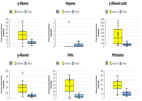 Box plots of the concentrations of (a) n-alkanes, (b) hopanes, (c) n-alkanoic acids, (d) n-alkanols, (e) PAHs, and (f) phthalates in sediments from the Al-Qahma and Al-Wajh lagoons, Saudi Arabia.