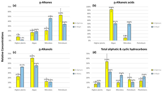 Plots showing the relative concentrations (%) of the terrestrial (higher plants), aquatic (algae), bacterial (microbes), and petroleum inputs of (a) n-alkanes (b) n-alkanoic acids, (c) n-alkanols and (d) total aliphatic and cyclic hydrocarbons in the sediments from the Al-Qahma and Al-Wajh lagoons, Red Sea coast of Saudi Arabia. (Algae include algal, diatomic, and planktonic inputs.)