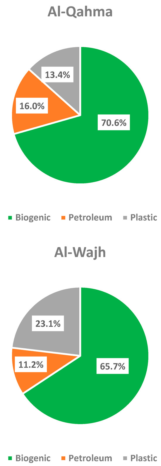 Plots showing the percentages of the natural, petroleum-related, and plastic sources in the sediments from the Al-Qahma and Al-Wajh lagoons, Red Sea coast of Saudi Arabia.