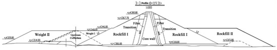 The dam crest elevation of clay core wall dam is 1385.5 m, the maximum dam height is 84.0 m, the dam crest length is 537.0 m, the upstream and downstream dam slopes are 1:2, and the dam crest width is 12.0 m. The dam body is divided into four areas: core wall, dam shell rockfill, filter layer, and transition layer. The dam body adopts clay core wall for anti-seepage. The riverbed section of the dam foundation adopts a 110 m deep anti-seepage wall connected to curtain grouting, and the anti-seepage plan of closed anti-seepage walls is adopted on both sides. The typical cross-section of the dam is shown in Figure 1.