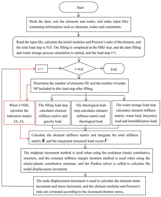 A flow chart of the filling process simulation of earth and rockfill dams.