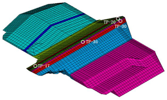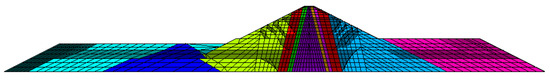 The three-dimensional finite element model of Luding clay core rockfill dam was established. As shown in Figure 4, the model mainly uses eight-node hexahedral elements. The total number of model elements was 33,665, and the total number of model nodes was 34,855. The model was divided into 10 material partitions such as core wall, upstream rockfill area, downstream rockfill area, filter layer, and transition layer, as shown in Figure 5.