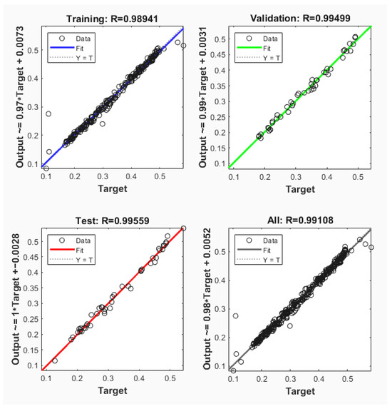 In this paper, three sensitive rheological parameters in the rockfill area and three sensitive rheological parameters in the core wall area were combined, and six rheological parameters corresponded to one fitness value. A total of 300 groups of parameter samples were selected for neural network training through orthogonal method and random access method, and the fitting effect of test set, verification set, training set, and prediction model prediction output value was obtained according to the network regression curve, as shown in Figure 6. It can be seen that the mean squared error remained below 0.02. According to the network regression curve, it can be seen that the test set, validation set, training set, and prediction model’s predicted output values fit well. By substituting the trained network into the genetic algorithm for optimization and continuously adjusting and analyzing the data, the following parameters for the genetic algorithm in this article were obtained: the initial population number was 200, the initial elite number was 10, the crossover genetic probability was 0.8, the mutation probability was 0.01, the immigration probability was 0.2, and the termination evolutionary algebra was 177. The rheological parameters of our inversion were obtained using the genetic algorithm optimization, as shown in Table 3: