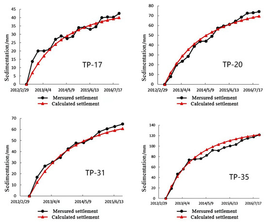 After the inversion parameters are obtained using the above inversion method, the finite element calculation of Luding earth-rock dam was carried out by using the inversion parameters combined with the four measuring points selected in this paper. The calculated settlement value obtained using the finite element calculation was compared with the measured settlement value of the measured data, as shown in Figure 7. It can be seen that the fitting effect between the calculated value and the measured value was good, so the numerical simulation results were consistent with the actual dam body’s behavior, and the simulation results can represent the actual dam body situation.