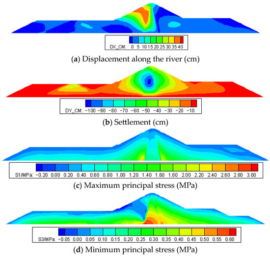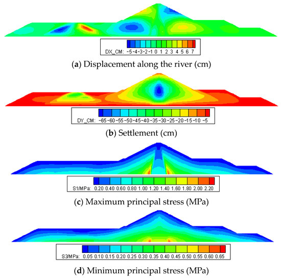 The stress and deformation of the dam were calculated in the completion period and the impoundment period, and the safety of the dam was evaluated according to the stress and deformation of each position of the dam body. This article selected the 0 + 193 section as the representative research section, and the cloud diagram of the horizontal displacement, settlement, and maximum and minimum principal stresses calculation results under the two working conditions of completion and water storage of this section is shown in Figure 8 and Figure 9. The deformation characteristic values of the dam during the completion period and the impoundment period are shown in Table 4.