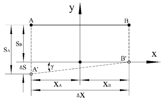 The crack research of earth-rock dams mainly includes two aspects: the crack judgment and the crack propagation simulation [34,35]. The current methods for calculating cracks in earth-rock dams mainly include settlement analysis, the deformation inclination method, Leonard’s method, etc. [36,37,38,39,40]. In this paper, the deformation inclination method was used to calculate and analyze the cracks in the Luding core wall earth-rock dam. Figure 10 is the basic principle of the deformation inclination method. x indicates the horizontal direction and y indicates the direction in which the uneven settlement occurs. A and B are two points with a horizontal distance of . The settlements and occur and move to and , respectively. The settlement difference between the two is . The deformation inclination between the two points is