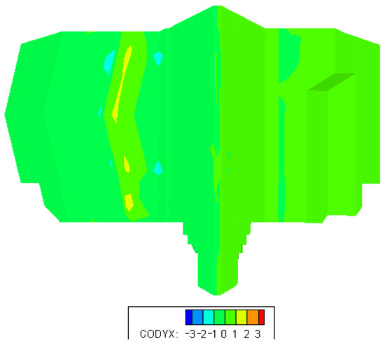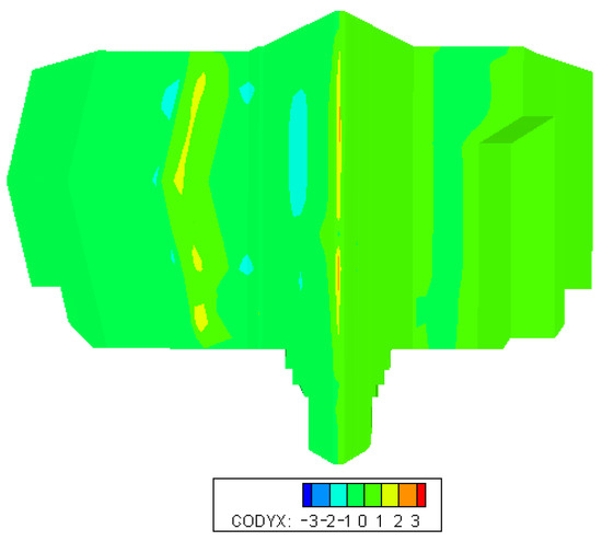 Comparing Figure 8 and Figure 9, it can be seen that after the dam impoundment, the upstream rockfill material underwent significant changes in both horizontal displacement and settlement due to water storage deformation. The upstream rockfill area experienced significant upstream displacement and settlement, which is highly likely to cause uneven settlement at the dam crest, leading to longitudinal cracks at the dam crest and endangering the safety of the dam. Therefore, it was necessary to calculate and analyze cracks based on the analysis of dam stress and deformation.