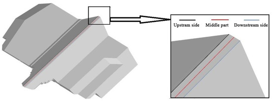 In order to deeply study the change law of the deformation gradient in the dam crest area, three reference lines parallel to the dam axis running through the left and right banks were selected at the upstream, middle, and downstream sides of the dam crest, respectively, as shown in Figure 13, to study the change law of the deformation gradient on the three lines.