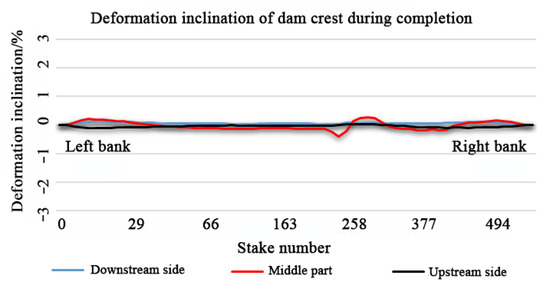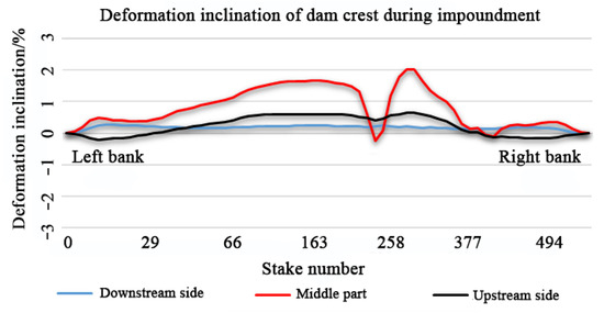 The deformation inclination on the three lines during the completion period and the impoundment period is shown in Figure 14 and Figure 15. It can be seen that the deformation inclination of the dam crest during the completion period was below 1%, and there would be no cracks, which is in line with the actual situation. During the water storage period, due to the wetting deformation caused by the flooding of the upstream rockfill area there is a tendency for the upstream dam slope and shell to detach from the core wall, resulting in an increase in the deformation inclination at the dam crest. However, the value was below 3% and no cracks were generated, which is in line with the actual situation. At the same time, it can be clearly seen that the deformation gradient of the upstream, middle, and downstream sides of the dam crest basically followed the law of large deformation gradients in the middle along the dam axis and small deformation gradients on both banks. In addition, in the simulation results, the deformation inclination in the middle of the dam crest was greater than that on both the upstream and downstream sides of the dam crest, indicating that cracks were more likely to occur in the middle of the dam crest. The reason is that under the action of water storage humidification and water pressure, the upstream rockfill and the core wall are separated, and the dam crest is stretched perpendicular to the dam axis directly above the core wall. This trend is most significant during the initial impoundment period of the dam, and will be alleviated in the subsequent long-term operation. That is, when there are no other factors, the dam does not produce cracks during the initial impoundment period, so there is a high probability that cracks will not occur during the subsequent operation. This shows that the cracks on the dam crest are easily caused by the wetting deformation after the initial impoundment of the earth-rock dam, and the cracks on the dam crest may occur at the dam axis. Analyzing the deformation gradient value of the dam crest has important reference significance for judging whether the dam will produce cracks.
