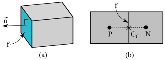 Because there is no governing equation dedicated for the pressure, the above continuity equation is used to derive the pressure equation. Two approaches are often used to arrange the grid system. One is the collocated grid, where pressure and velocities are stored at cell centers. The other approach is the staggered grid, where pressure is stored at cell centers and velocities are stored at cell faces. A checker-board oscillation likely exists in the collocated grid because the pressure of the current cell is decoupled from the discretized pressure equation [50,51]. This adverse oscillation can be eliminated by using the momentum interpolation technique of Rhie and Chow [52], or by using the staggered grid [50]. The staggered grid is cumbersome to implement and limits the shape of the cells used. Therefore, the collocated grid is used in this study. Following Rhie and Chow [52], the velocity at cell face f is obtained as follows by interpolating the momentum equation defined in Equation (12) based on the distance from cell center to face center (Figure 1b):