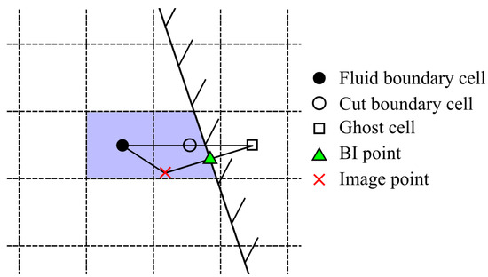 Because the IP usually does not coincide with a fluid cell center, its flow properties need to be interpolated from the surrounding cells. This is carried out by using a trilinear interpolation on the stencil consisting of eight neighboring points. When identifying the interpolation stencil for each image point, BI points are first marked for each IB facet. Since ghost cells do not contain flow data, they are not used in the data interpolation stencil. Instead, they are replaced with the corresponding BI points. The polygon (3D or 2D) formed by connecting fluid boundary cells and BI points encompasses the image point and forms the given IP’s interpolation stencil.