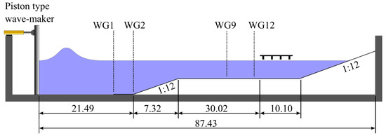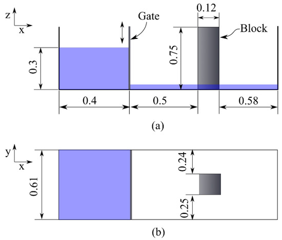 It is very challenging to carry out proper field experiments of tsunamis due to their destructive nature. Therefore, laboratory experiments using scaled models have been carried out to find insights into the underlying physics and develop the current state of knowledge. The experiments include run-up, pressure, and force measurements. Most of the past experiments modeled the tsunami inundation as a two-dimensional (2D) flow, and some of the recent experiments have given priority to the three-dimensional (3D) nature of the flow field, as summarized by St-Germain [7], Al-Faesly [8], and Istrati [9]. These experiments used dam-break flows [10,11,12,13,14,15] and solitary waves [9,16,17,18] to approximate tsunamis.
