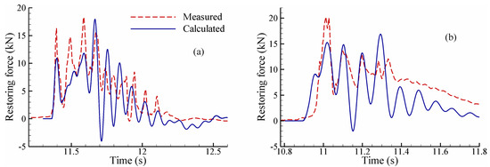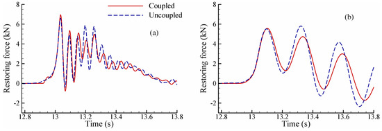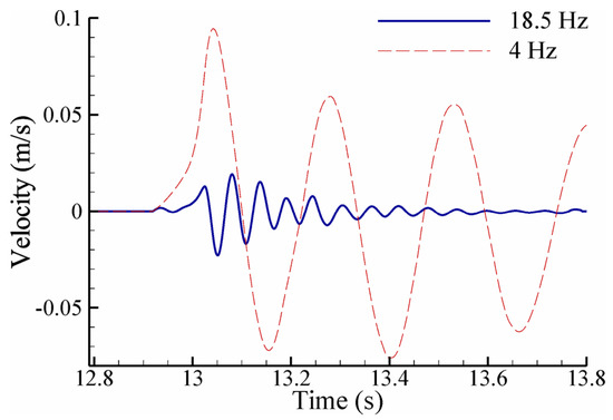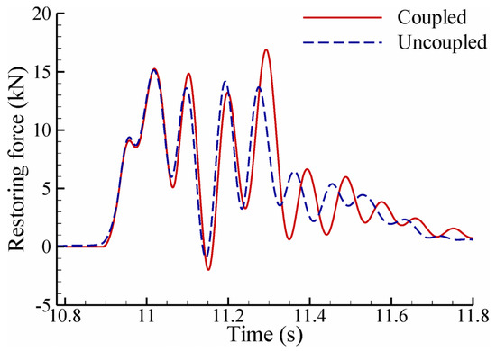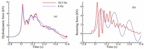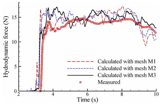 Equation (22) can be solved by a plethora of numerical time integration schemes, each of which has advantages and disadvantages. The selection of a suitable time integration scheme is based on the scheme’s accuracy, and more importantly, on the ability to tolerate or remove the high-frequency error/component possibly present in the hydrodynamic force imposed onto the structure. Some of the widely-used schemes include the Newmark method [67], generalized alpha method [68], and Bathe schemes [69,70]. The generalized alpha method is used in this study for solving the structural motion due to the ease of introducing controllable numerical damping into the system. It achieves high-frequency dissipation while minimizing low-frequency dissipation [68].