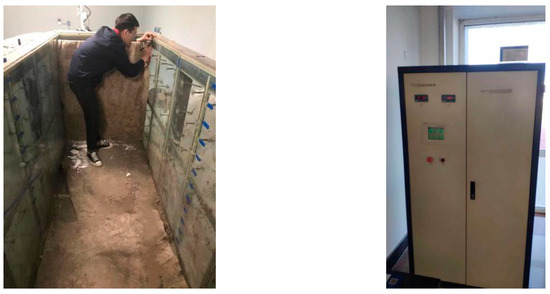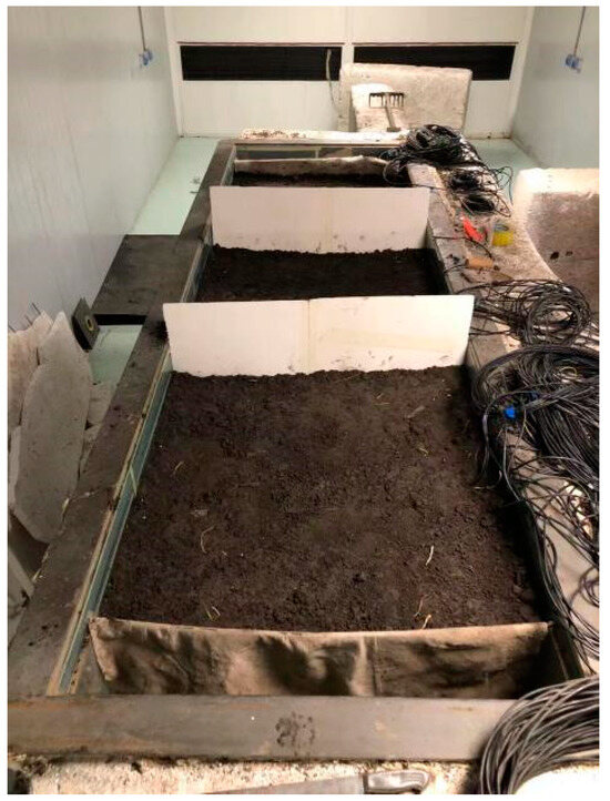 The experiment involved the utilization of powdery clay as the foundation soil. The soil samples were obtained by sun-drying and crushing the clay, followed by sieving through a 2 mm sieve. The samples were then prepared at a moisture content of 30% and a controlled dry density of 1.65 g/cm3. To ensure uniform moisture distribution, the surface of the soil samples was covered with cling film and left undisturbed for 48 h. It should be noted that the soil was not compacted to its maximum capacity, resulting in a general degree of compaction of 95%. In order to achieve uniform soil distribution, the filling process was conducted in layers, with each layer being 10 cm thick. The natural dry density of the soil served as the quality control standard for the layer-by-layer filling. Throughout the filling process, strict control was maintained over the height of the soil model. The completed soil model can be observed in Figure 3. To ensure the accuracy of the experimental results, three compartments were set up for parallel experiments. In each compartment, exactly the same experimental operations were performed to minimize random errors and uncertainties. In this way, the reliability and reproducibility of the experimental results can be better determined.