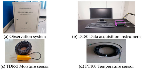 This experiment is conducted at the Wanjia Experimental Station of the Heilongjiang Water Resources Research Institute, specifically in their low-temperature laboratory. The laboratory houses an indoor model test chamber with dimensions of 3.0 m × 1.0 m × 1.3 m (L × W × H). The temperature within the laboratory is regulated by a temperature control system that can both warm and cool the environment. The schematic diagram of the model box and temperature control equipment can be seen in Figure 1. In order to collect data on the temperature and moisture of the soil during freeze–thaw cycles, several instruments are utilized. These instruments include the Cold Zone Permafrost Laboratory Monitoring System, DT80 Data Acquisition Instrument Mainframe + CEM20 Expansion Module (CAS Dataloggers, Chesterfield, OH, USA), PT100 Temperature Sensor (IST, Ebnat-Kappel, Switzerland), and TDR-3 Moisture Sensor (Nutech International, New Delhi, India), as depicted in Figure 2.