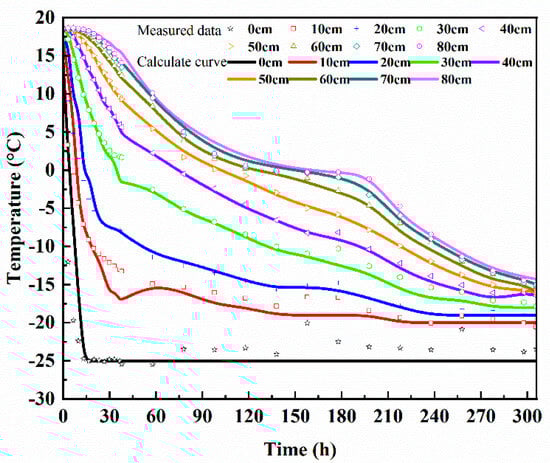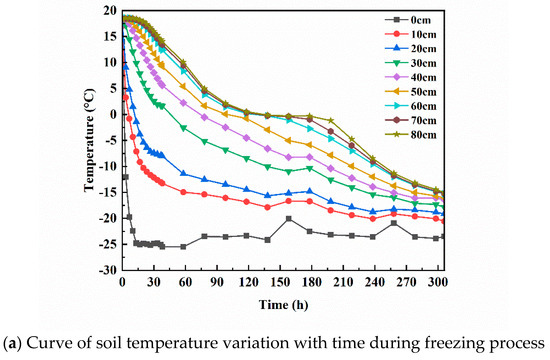 Figure 6a illustrates the change in soil temperature over time during the freezing process. In the illustration, 0 cm represents the top layer of soil, 10 cm represents 10 cm from the top layer of soil, and 80 cm represents 80 cm from the top layer of soil. The process can be divided into three main stages: rapid cooling, slow cooling, and freezing stabilization. The rapid cooling stage, which lasts from 0 to 58 h, is characterized by a significant decrease in soil temperature. The temperature differences at various depths are as follows: 31.957 °C at 10 cm, 28.833 °C at 20 cm, 21.088 °C at 30 cm, 16.215 °C at 40 cm, 12.963 °C at 50 cm, 12.963 °C at 60 cm, and 16.215 °C at 60 cm. The slope of the soil temperature versus time curve shows that energy exchange and temperature changes are more pronounced at shallower depths. As the depth increases, the amplitude of temperature change decreases, indicating a gradual reduction in temperature volatility. The decrease in the cold end temperature leads to a downward progression of the negative temperature and an increase in the temperature gradient. Consequently, the freezing front moves rapidly downward, resulting in relatively smooth temperature changes in the deeper soil layers and violent temperature changes in the surface layer. The slow cooling phase is a stage of soil temperature change that may not be very obvious at the beginning of the process but can be initially judged by observing the trend of soil temperature change. When the rate of temperature decline gradually slows down, this may indicate that the slow cooling phase has begun. After 58 h, the rate of temperature drop gradually slows down, marking the onset of the slow cooling stage. Eventually, as time progresses, the temperature stabilizes and remains relatively constant, indicating the freezing stabilization stage.