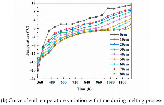 Figure 6b illustrates the temporal change in soil temperature throughout the entire melting process. During the melting stage, the soil temperature exhibited a gradual increase. Notably, there were significant variations in soil temperature changes across different soil layers. Specifically, the soil temperature at a depth of 10 cm experienced a change of 28.64 °C, while the temperature change at a depth of 20 cm was 28.69 °C. At a 30 cm depth, the temperature change was 25.71 °C, followed by 23.5 °C at a 40 cm depth, 22.09 °C at a 50 cm depth, 20.39 °C at a 60 cm depth, 18.93 °C at a 70 cm depth, and 17.35 °C at a 80 cm depth. As the soil layer depth increased, the amplitude of soil temperature change sequentially decreased, indicating a more stable trend in temperature variation. This can be attributed to the fact that deeper soil layers are further insulated from external temperatures, resulting in greater heat loss through the process of heat conduction. Consequently, the amplitude of temperature change in this region, relative to the shallow soil area, exhibits a decreasing trend and a certain delay phenomenon.
