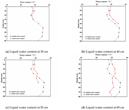 Figure 7 depicts the moisture change patterns during the soil melting stage. The figures illustrate that as the temperature rises, the soil moisture undergoes a transition from solid to liquid, resulting in a gradual increase in soil water content. Specifically, at a depth of 30 cm, the water content varies between 0.12% and 0.52% during the melting process. At a depth of 40 cm, the water content ranges from 0.47% to 1.08%. Similarly, at a depth of 50 cm, the water content varies between 0.46% and 1.96%, while at a depth of 80 cm, the water content ranges from 0.8% to 3.23%. During soil thawing, water in the upper thaw zone moves downwards towards the freeze–thaw interface due to the combined effects of gravity and temperature gradient. Some of this water freezes into ice, while the remaining portion exists in liquid form. However, the presence of the aggregated ice layer hinders further infiltration, causing the water from the thaw zone to accumulate near the freeze–thaw interface, resulting in the aggregation of liquid water.