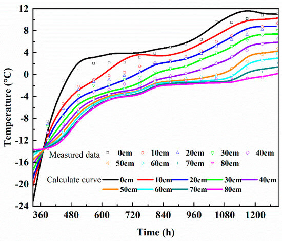 Figure 10 illustrates the patterns of temperature variation at nine specific observation points in the specimen, both measured and numerically calculated. Generally, the numerically calculated temperature changes align well with the measured data. During the freezing stage, the temperatures at the observation points deviate from the initial temperature and gradually stabilize over time, reaching a constant value. The freezing process is characterized by the downward movement of the freezing surface and an increase in the depth of the frozen area. The advancement of the freezing front can be divided into three stages. In the initial 58 h, the freezing front progresses rapidly, accompanied by a larger temperature gradient. Moisture begins to migrate from the bottom to the top, resulting in an increase in water content at the top. After 58 h, the speed of the freezing front gradually slows down, leading to a slower temperature change. This allows sufficient time for the bottom water to migrate upwards. Eventually, the freezing front ceases to advance, and the temperature field stabilizes. During the melting phase, the soil temperature gradually rises and exhibits significant variation between layers. Furthermore, it is evident that in the early stages of thawing, the points closer to the upper boundary of the soil column experience a faster rate of temperature increase. This can be attributed to the larger temperature gradient near the upper interface of the soil column.
