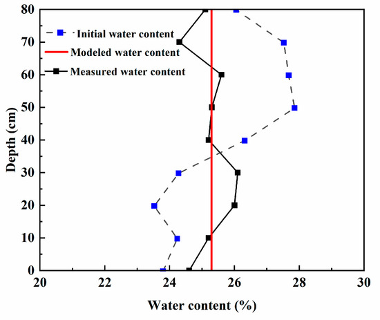 Based on the findings presented in Figure 11, it is evident that the numerical simulation of soil water content during the thawing stage exhibits some discrepancies when compared to the measured results. However, the overall result is acceptable. The formation of the maximum water content peak at a depth of 20–30 cm during the melting process can be attributed to several factors. Firstly, water in the upper melting zone migrates towards the freeze–thaw interface due to gravity and the temperature gradient. A portion of this water freezes into ice, while the remaining liquid water faces difficulty in further infiltration due to the obstructive effect of the aggregated ice layer. Consequently, the water from the melting zone accumulates near the freeze–thaw interface, resulting in the formation of a peak point of water content at this location. The disparity between the observed data and the model calculation can be attributed to two main reasons. Firstly, the soil test involves complex basic parameters and boundary conditions, whereas the model calculation tends to lean towards an idealized state and fails to account for all the conditions. Secondly, errors in the measurement of the test equipment prevent an accurate reflection of water migration in the soil under actual working conditions.
