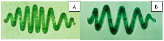Microphotograph picture of A. platensis. (A,B) Filaments are multicellular single-row filaments without heterotypic cells, deep (dark) blue-green, with bubbles. Most of them are spindle-shaped, the number of spirals of algal filaments is 3–12, and most of them are 7–10; the helix width is 32.5~45.0 μm, and the pitch is 32.5~55.0 μm.
