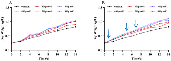 Effect of Na2SeO3 on the growth of A. platensis. (A) One-time addition; (B) batch additions. Arrows indicate the time of sodium selenite supplementation.